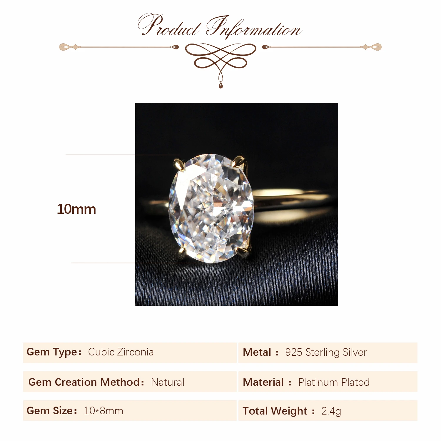 Paramètres de la pierre : 10 × 8 mm (forme ovale)